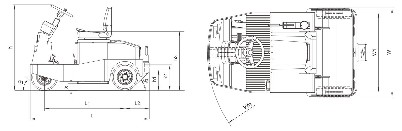本车用于移动装载有各类物品的挂车,采用三支点设计,具有转弯半径小、通过性好、无噪音、无污染等显著特点;