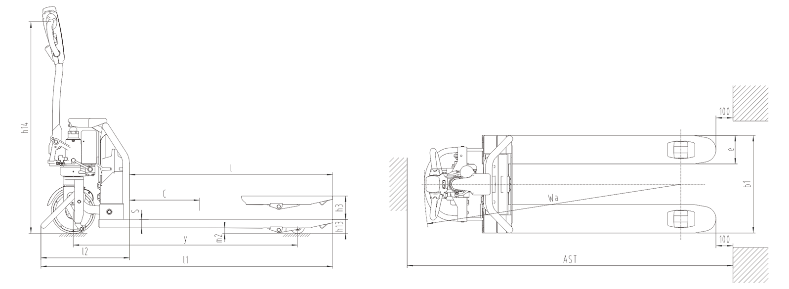 货叉头部形式可按不同标准的托盘选择双叉轮或选择单叉轮。双叉轮的结构,货叉头部带有一个导向轮。单叉轮的结构,货叉头部带有两个导向轮,进出美式托盘非常顺畅;