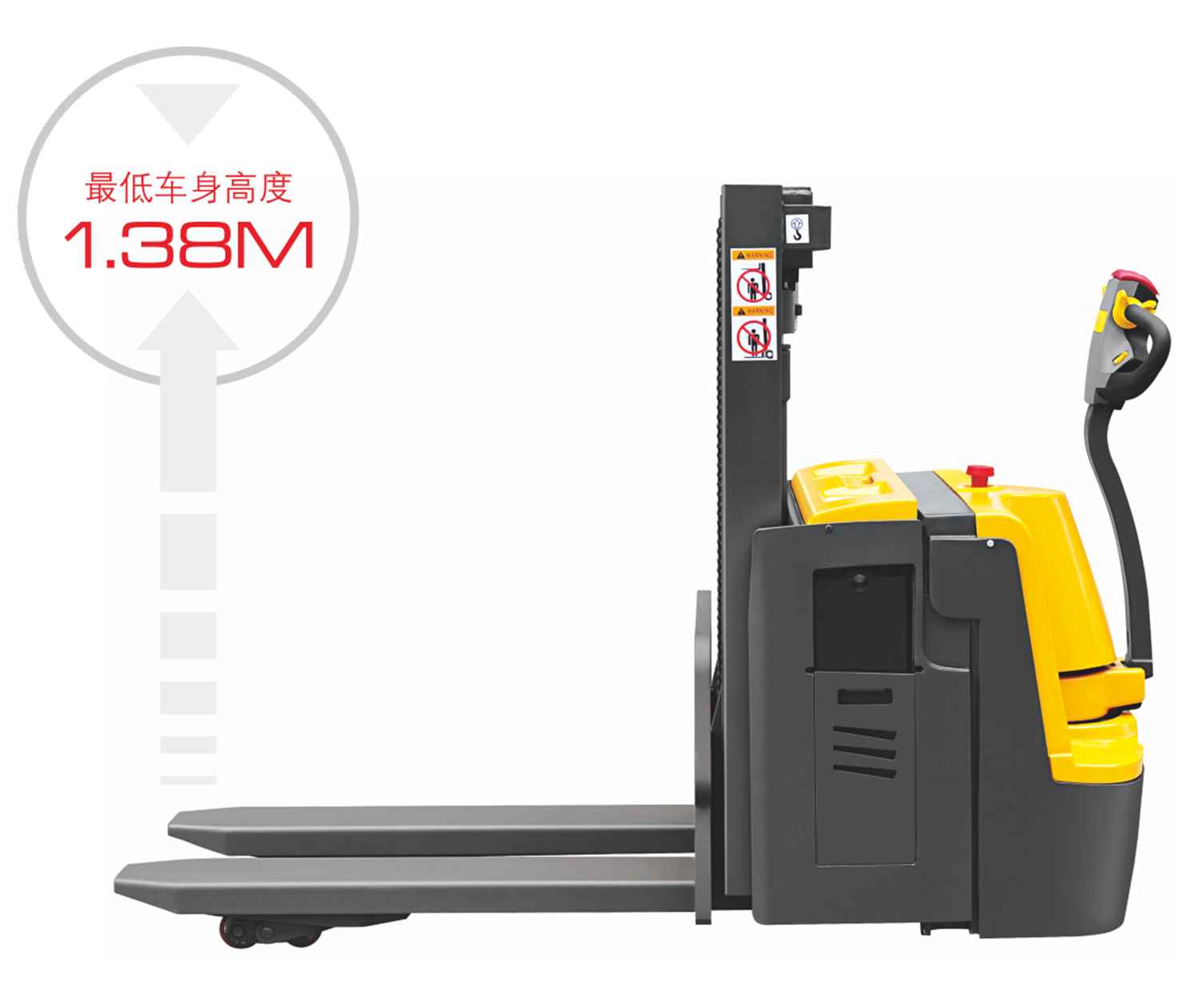站人平台设计有安全保护开关,当人员不在操作平台时,车辆自动锁住行驶功能。提高了车辆的安全等级;